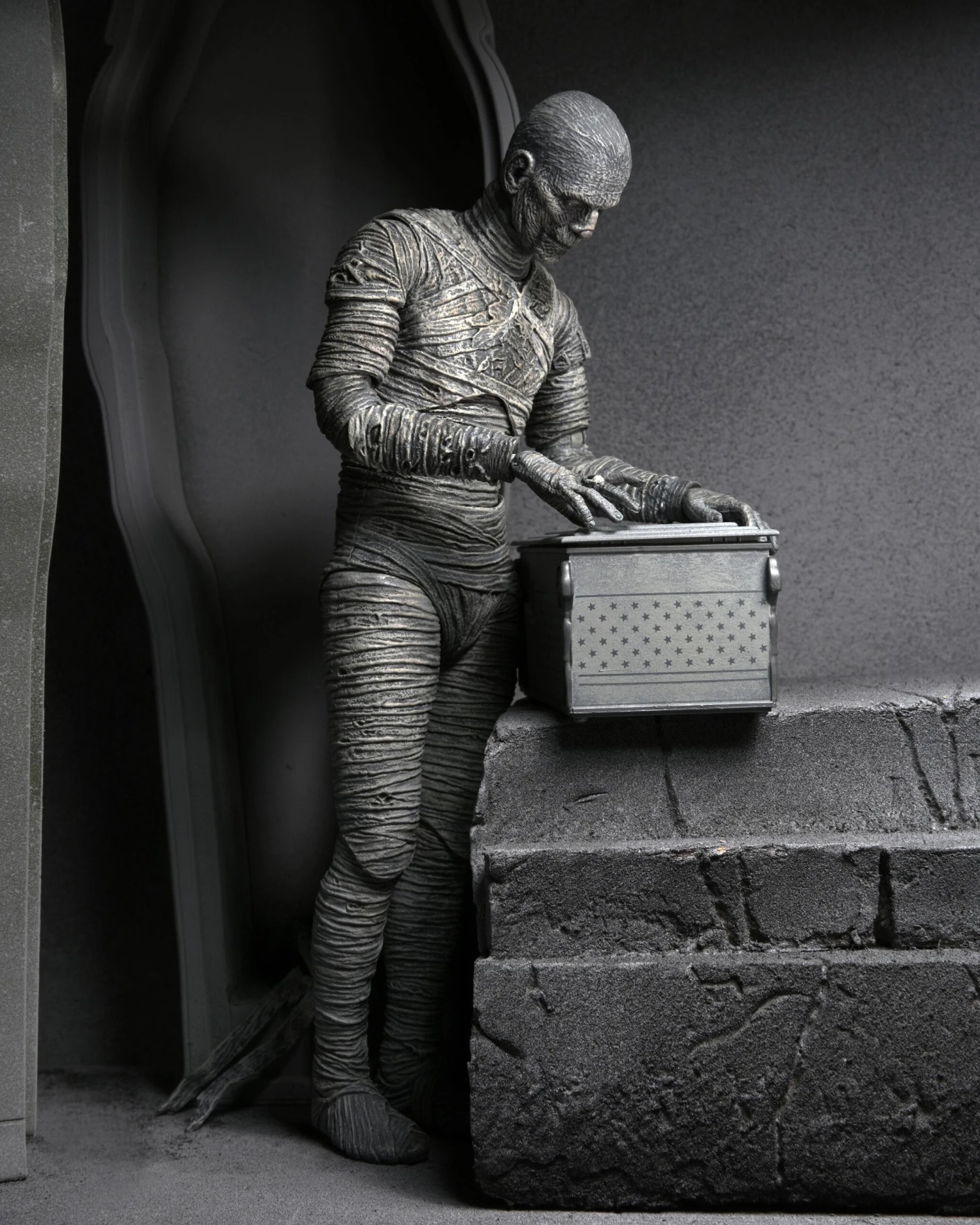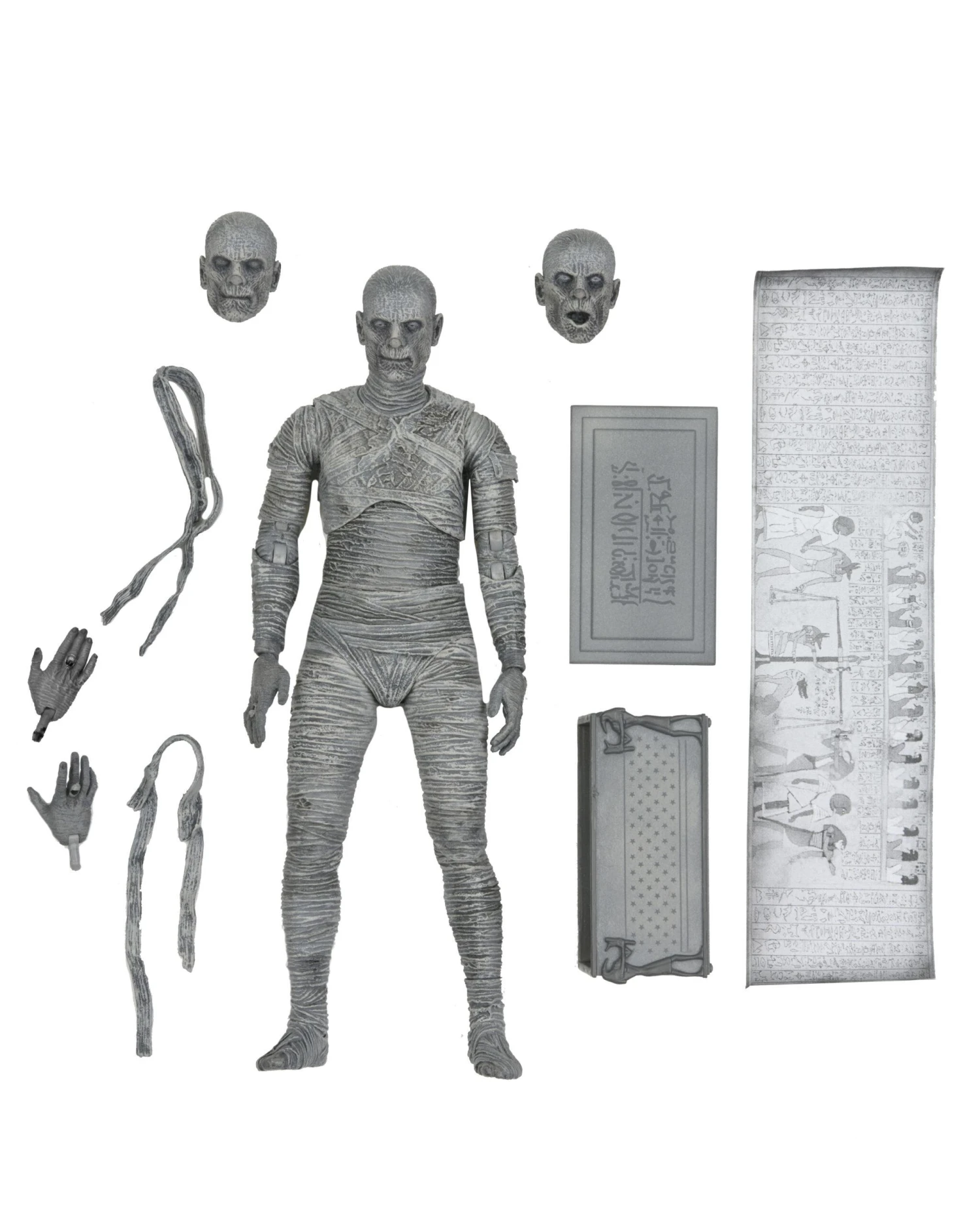 For the 90th anniversary of the extraordinary silver-screen classic, NECA presents The Mummy action figure in authentic black-and-white! In this Universal Monsters classic of horror, Boris Karloff shines as the ancient Mummy in a tale of love transcending death. The sculpt captures the intricate special effects makeup that required eight hours to apply and two hours to remove.