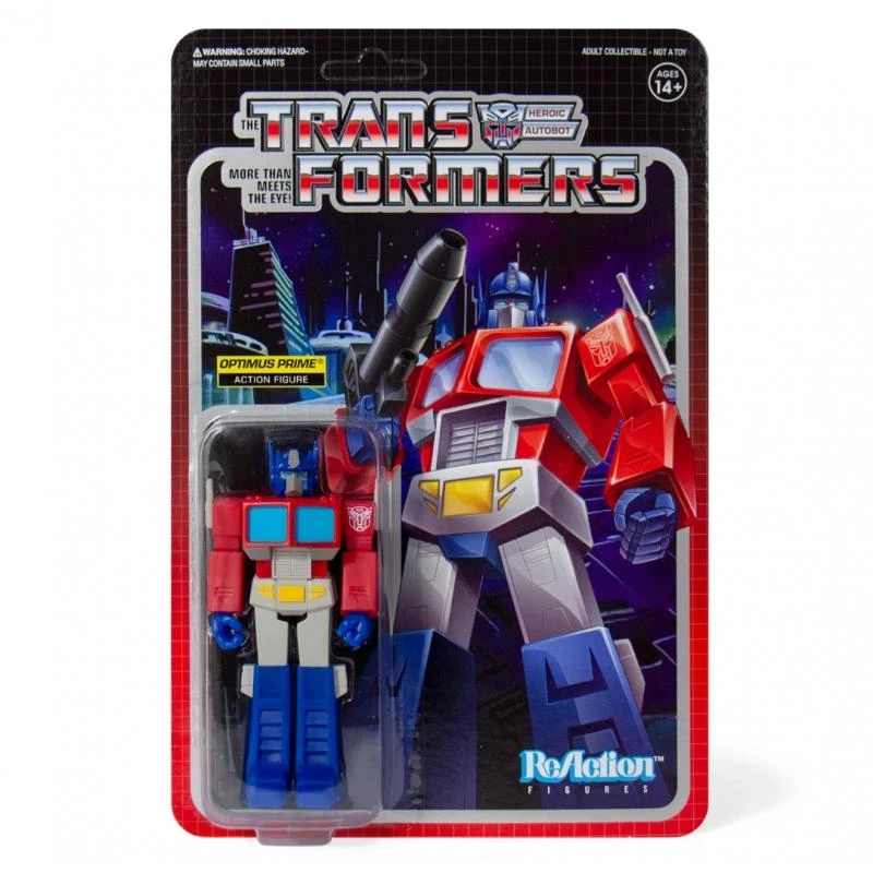 “Robots in disguise!” The Super7 x Transformers collaboration expands as the Autobots and Decepticons join the 3.75-inch ReAction Figure world! Optimus Prime, leader of the Autobots, comes with Ion Blaster accessory. Packaged on a card back featuring brand new retro-style art.